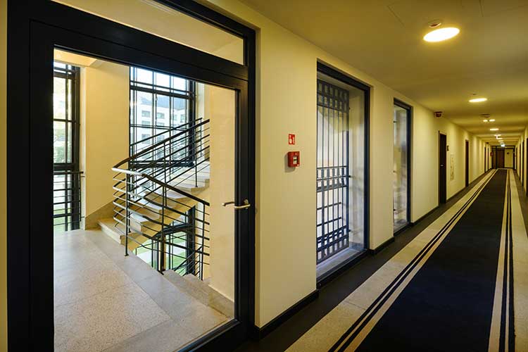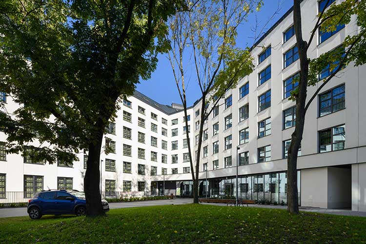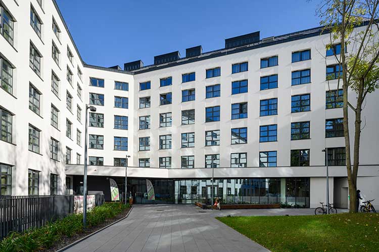 Architektura budynku bazuje na harmonijnym zestawieniu odrestaurowanej historycznej części z nowoczesnymi skrzydłami o prostej formie i dużych przeszkleniach. Dzięki temu obiekt łączy klimat akademicki z komfortem na miarę XXI wieku. Duże przeszklenia nadają lekkości bryle i doświetlają wnętrza, a nowoczesne systemy stolarki, takie jak drzwi MB-86 czy konstrukcje przeciwpożarowe MB-78EI marki WIŚNIOWSKI, gwarantują bezpieczeństwo i trwałość. Studenci zyskują dostęp do nowoczesnych pokoi oraz przestrzeni wspólnych (miejsc do nauki, spotkań i odpoczynku), które dzięki przemyślanej aranżacji zachęcają do integracji i aktywnego życia akademickiego. Duże przeszklenia zapewniają bliskość światła dziennego i kontakt z otoczeniem, a zastosowana stolarka WIŚNIOWSKI sprawia, że budynek jest bezpieczny, energooszczędny i trwały.