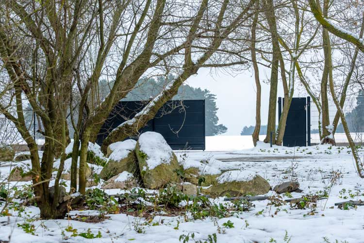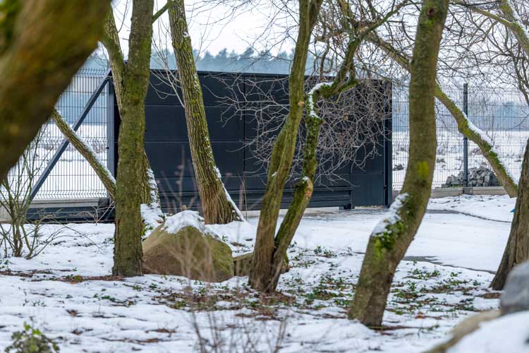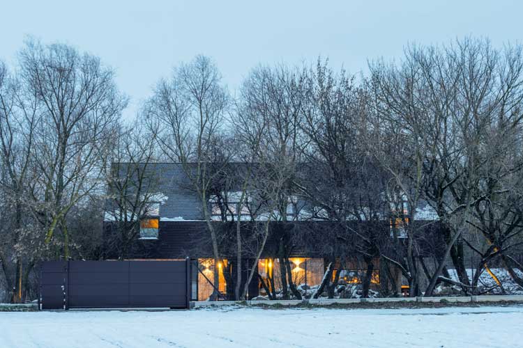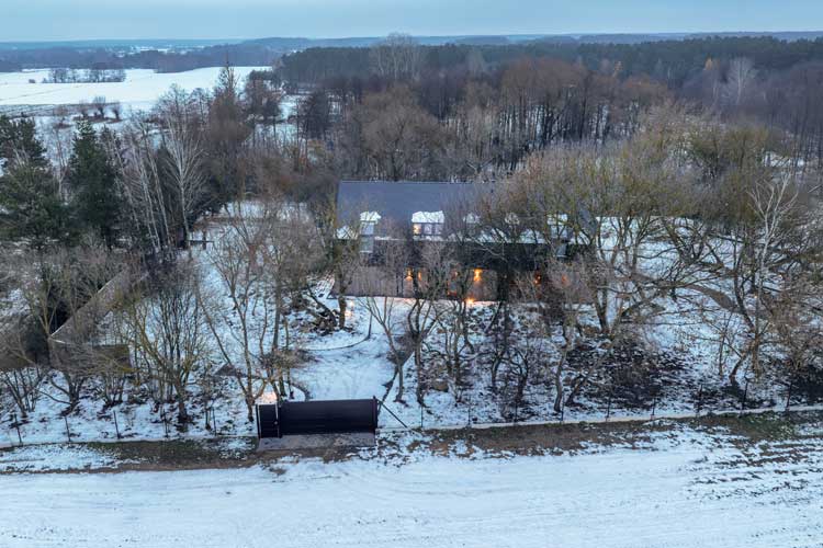 Wokół domu rozciąga się zimowy, niemal surowy krajobraz pól i lasów. Brak sąsiadującej zabudowy dodaje miejscu intymności, dlatego ogrodzenie musiało zapewniać bezpieczeństwo, a jednocześnie nie zakłócać naturalnej harmonii otoczenia. Właśnie z tego powodu wybór padł na system Home Inclusive WIŚNIOWSKI we wzorze AW.10.200 i kolorze RAL 9005 MAT — głębokiej, matowej czerni. To minimalistyczne, solidne ogrodzenia, które doskonale współgrają z nowoczesnym domem w stylu barn-house, podkreślając jego prostą, geometryczną formę.