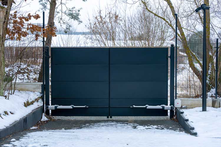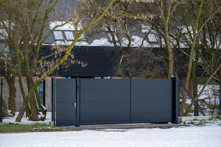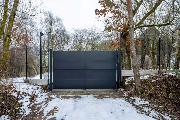 Poza ogrodzeniem Home Inclusive aktorka zastosowała również przemysłową bramę przesuwną PI 95 z panelowym wypełnieniem Vega B od WIŚNIOWSKI. To również konstrukcja samonośna, idealna do wymagających warunków — zwłaszcza zimowych. Wygląda lekko dzięki ażurowemu wypełnieniu, a jednocześnie pozostaje bardzo trwała. W zimowym krajobrazie panel kratowy subtelnie przepuszcza światło i tworzy delikatną, graficzną siatkę na tle śniegu i drzew.