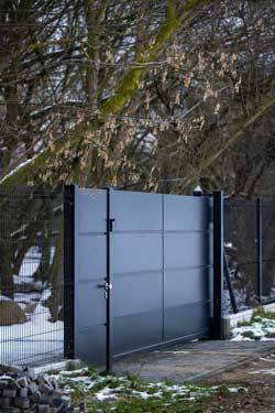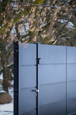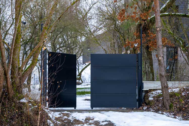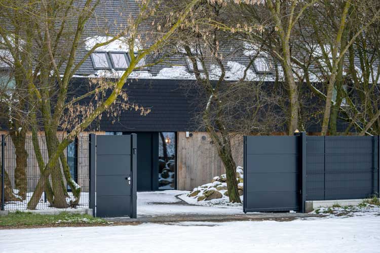 Ogrodzenie obiega posesję ze wszystkich czterech stron i w całości wykonane jest z przeziernych paneli VEGA, które nadają mu lekkości i nowoczesnego charakteru. Co ciekawe, aż na trzech liniach ogrodzenia znajdują się bramy wjazdowe posesyjne — w tym dwuskrzydłowa brama WIŚNIOWSKI z kolekcji Home Inclusive we wzorze AW.10.200, która w zimowej aurze prezentuje się wyjątkowo elegancko. Jej prosta forma, poziome linie i brak zbędnych zdobień podkreślają nowoczesny styl całej posiadłości i harmonijnie dopełniają minimalistyczną kompozycję ogrodzenia.