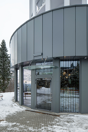 Jednym z największych wyzwań technicznych projektu była realizacja górnej partii fasady, zaprojektowanej na planie koła. – Zamiast typowych w takich przypadkach szyb giętych na całym obwodzie, zastosowaliśmy system słupowo-ryglowy oparty na prostych modułach. Odpowiednio dobrane profile kątowe, uszczelki oraz tolerancje montażowe pozwoliły uzyskać efekt płynnej, lekkiej bryły, bez wizualnych podziałów zakłócających odbiór architektury – wyjaśnia Czesław Matląg, dyrektor sprzedaży i obsługi inwestycji WIŚNIOWSKI.