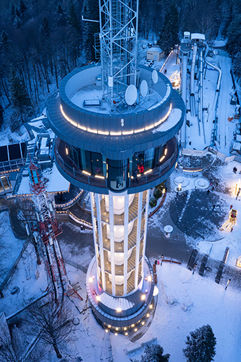 Lokalizacja wieży w samym sercu historycznego Parku Zdrojowego na Górze Parkowej wymagała szczególnej wrażliwości projektowej. Nowa dominantą nie miała zdominować otoczenia, lecz stać się jego naturalnym dopełnieniem. Stąd decyzja o szerokim zastosowaniu przeszkleń, które wizualnie „znikają” w pejzażu, oferując jednocześnie panoramiczny widok 360° na Krynicę-Zdrój, Beskid Sądecki, a nawet Tatry.
