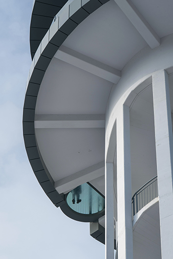 Centralnym elementem wieży jest przeszklony taras widokowy, częściowo osłaniający przed niekorzystnymi warunkami atmosferycznymi. Takie rozwiązanie umożliwia korzystanie z wieży przez cały rok, także przy wietrze czy niskich temperaturach, bez rezygnacji z bezpośredniego kontaktu z przestrzenią.