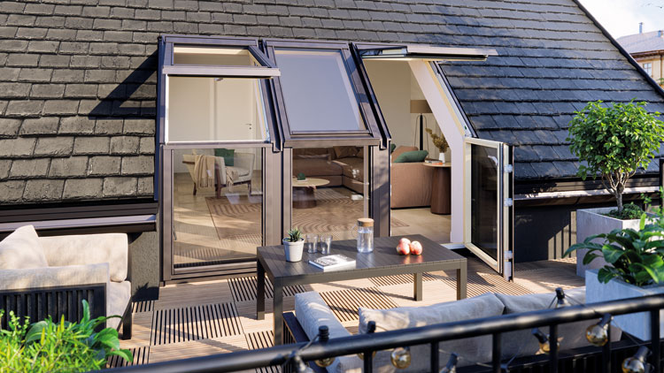 Okna tarasowe FAKRO umożliwiają wygodne wyjście na dachowy taras, zamieniając poddasze w zieloną strefę relaksu