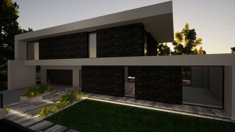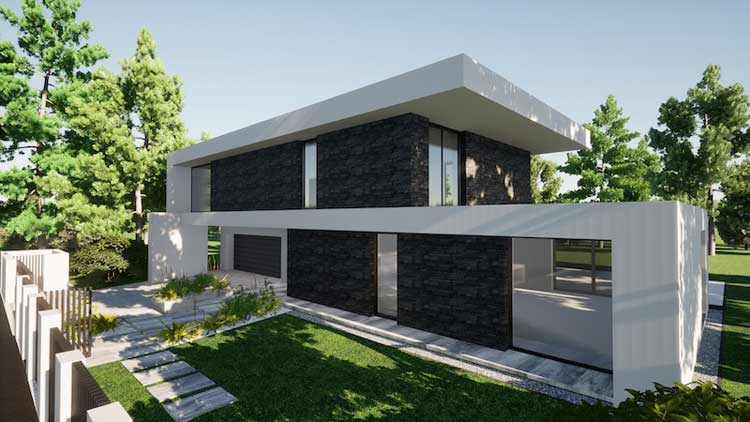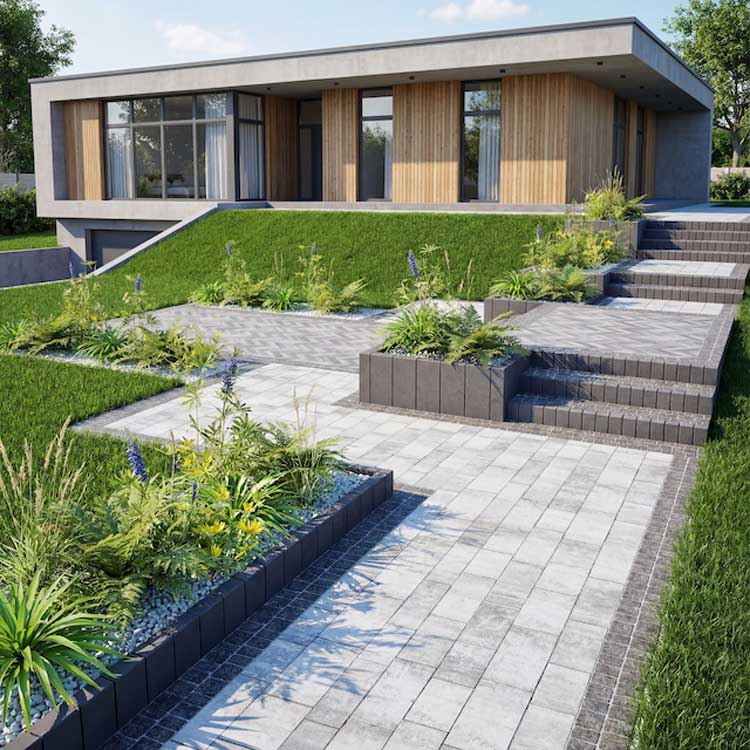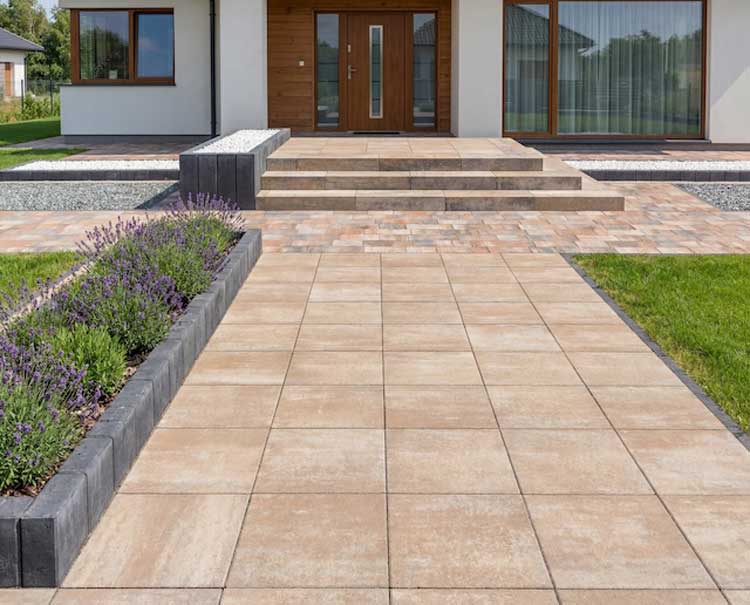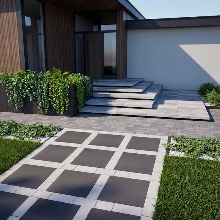 Projektowanie przestrzeni frontowej najlepiej rozpocząć od wyznaczenia alejki prowadzącej od furtki do drzwi. Musi być ona w pełni komfortowa w codziennym użytkowaniu. Zastosowanie wielkoformatowych płyt betonowych pozwala znacząco ograniczyć liczbę spoin, co w efekcie poprawia komfort akustyczny podczas poruszania się po nawierzchni. Optymalna szerokość takiej alejki wynosi od 120 do 150 cm. To precyzyjnie wyliczona przestrzeń, która pozwala na swobodne minięcie się dwóch osób. Poza samą funkcjonalnością, w nowoczesnej architekturze niezmiernie ważny jest także konsekwentny wygląd. Najchętniej wybierane są geometryczne kształty i odcienie szarości. Materiałami, które doskonale wpisują się w projektowe trendy, są na przykład płyty Polbruk Magna oraz Polbruk Bosso Mezzo. Magna to jedna z największych płyt dostępnych na rynku. Występuje w dwóch rozmiarach - 100x75 oraz 75x50 cm, ma gładką fakturę i jest oferowana w czterech wariantach kolorystycznych - melanżach nerino i adular oraz pełnych kolorach - szarym i grafitowym. Płyty Magna, dzięki dostępności w dwóch grubościach 8 i 10 cm, sprawdzają się zarówno na alei prowadzącej do domu, jak i na podjeździe przeznaczonym dla samochodów osobowych.