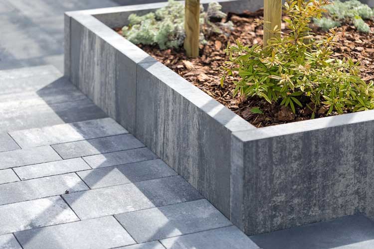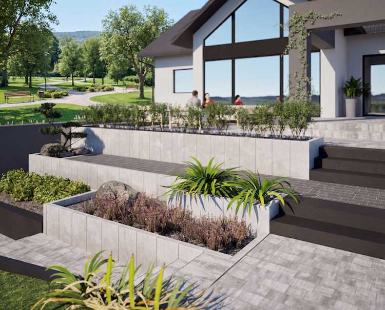 Nawet najlepiej zaplanowana alejka zyska, jeśli zadbamy o jej odpowiednią oprawę. W nowoczesnych aranżacjach nie należy przesadzać z dodatkami, ale warto uwzględnić je w projekcie, ponieważ mogą znacząco zwiększyć funkcjonalność projektowanej przestrzeni. W strefie wejściowej doskonale sprawdza się betonowa galanteria, w tym przede wszystkim palisady. Ponieważ są to elementy wysokie, idealnie nadają się do budowania form przestrzennych. Z powodzeniem stworzymy z nich efektowne, podwyższone donice wzdłuż alejki, które nie tylko pięknie wyeksponują roślinność, ale dodatkowo zabezpieczą nawierzchnię ścieżki przed rozsuwaniem elementów. Do wyboru jest wiele ciekawych formatów. Wśród nich wyróżnia się palisada Magna, która w zależności od sposobu ułożenia osiąga wysokość 75 lub 100 cm. Warto po nią sięgnąć, ponieważ idealnie współgra z przedstawionymi wcześniej wielkoformatowymi płytami z tej samej rodziny, co gwarantuje spójną, harmonijną aranżację. Oprócz niej do dyspozycji mamy smukłą palisadę Slim o wysokości 100 cm oraz wszechstronną palisadę Hestra, dostępną w wariantach 40, 60, 80, 100 i 120 cm. Elementy te, występujące w modnych odcieniach szarości, to doskonały materiał do wznoszenia donic wolnostojących lub kaskadowych rabat. Do budowy takich wielopoziomowych konstrukcji kwiatowych szczególnie dobrze nadaje się system Hestra ze względu na dużą elastyczność w doborze wysokości. W strefie wejściowej nie może zabraknąć również roślin. Ich dobór zależy wyłącznie od preferencji domowników. Najczęściej ścieżce towarzyszą zadbane trawniki lub barwne rabaty, które stanowią jej naturalną, zieloną oprawę.