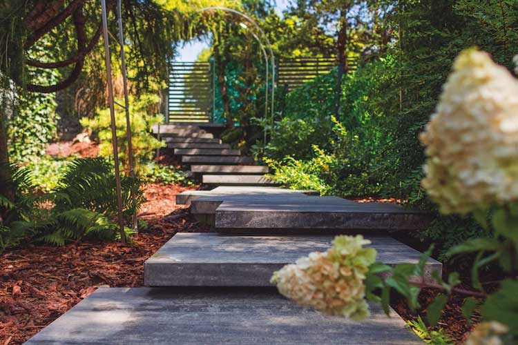 Rozwiązanie to polega na ułożeniu płyt w równych odległościach od siebie, przy jednoczesnym utrzymaniu stałej szerokości samej alejki. Odległość między płytami nie powinna być większa niż naturalna długość kroku. Powstałe w ten sposób przestrzenie można wypełnić jasnymi kamykami, uzyskując bardzo wyrazisty i nowoczesny rysunek ścieżki.