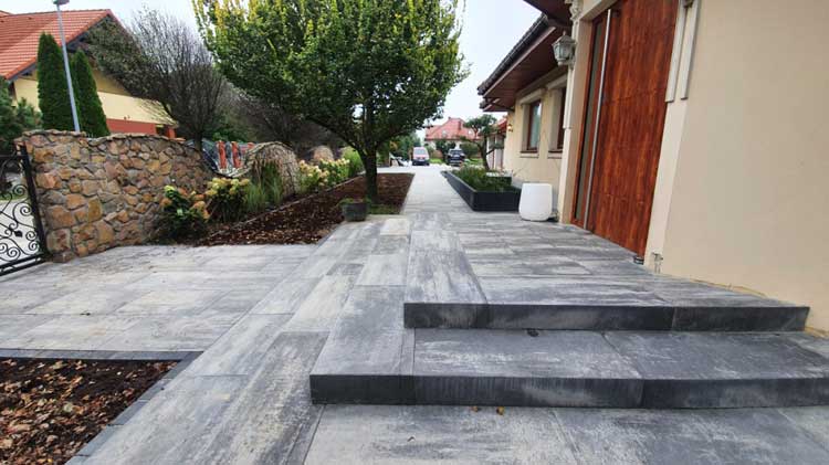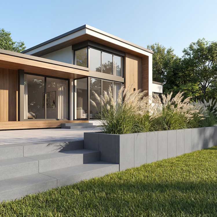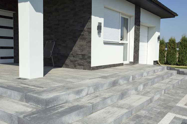 Reprezentacyjna alejka i towarzysząca jej zieleń prowadzą nas wprost do drzwi. Często jednak wejście do domu wymaga pokonania różnicy wysokości. Zróżnicowanie poziomów na posesji to naturalne zjawisko, które można przekuć w atut projektowy. Odpowiednio zaplanowane schody, nie tylko ułatwiają codzienne poruszanie się, ale też porządkują strefę wejściową i dodają jej nowoczesnego charakteru. W takiej sytuacji warto skorzystać z gotowych rozwiązań, takich jak stopnie schodowe Grando czy Magna. Wybór konkretnego rozwiązania zależy od wizji architektonicznej. Zwolennicy standardowych układów docenią model Grando. To monolityczny stopień schodowy o gładkiej fakturze, wymiarach 37x100 cm i wysokości 15 cm. Jest on dostępny aż w dziewięciu kolorach, co ułatwia jego dopasowanie do barwy nawierzchni lub elewacji. Z kolei w przypadku znacznego podwyższenia wejścia do domu albo gdy szukamy niebanalnego, przyciągającego wzrok rozwiązania, świetną alternatywą jest montaż tak zwanych schodów lewitujących. Technika ta polega na układaniu kolejnych stopni z lekkim przesunięciem i ukryciu konstrukcji wsporczej, dzięki czemu schody wyglądają jakby unosiły się w powietrzu. Wymaga to użycia dużych i niskich elementów bazowych. W tej roli idealnie sprawdzają się stopnie Magna, które przy zaledwie 8 cm wysokości oferują znacznie większą powierzchnię o wymiarach 75x100 cm. Wykorzystanie stopni z tej samej rodziny, co opisane wcześniej płyty oraz palisada, to najprostszy sposób na zachowanie pełnej spójności wizualnej między alejką, donicami a samym wejściem do budynku.