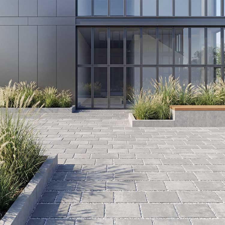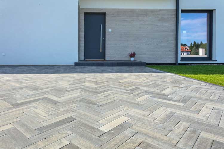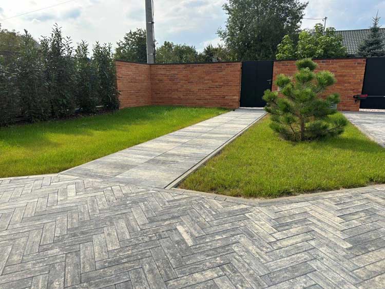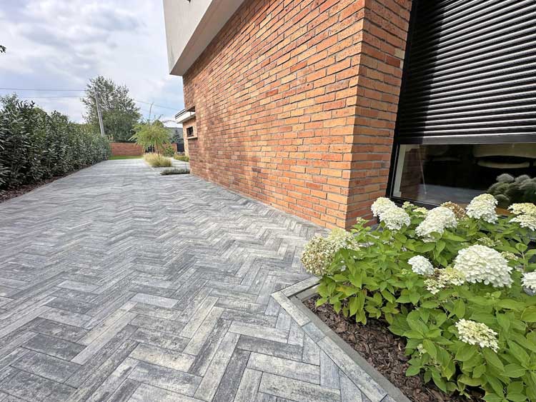 Jeśli głównym celem projektu podjazdu jest stworzenie wyrazistej aranżacji, warto zwrócić uwagę na kostkę Polbruk Metrik. Jest to wyjątkowo smukły element o wymiarach 7x28 cm, dostępny w grubościach 6 i 8 cm, więc doskonale nadaje się na podjazd. Jest dość uniwersalny, bo w gamie kolorów znajdują się szarości oraz lubiany w nowoczesnej architekturze corten, czyli kolor rdzawej blachy. Unikalność tego rozwiązania polega na możliwości wyboru między fakturą gładką a postarzaną, a także na dużej swobodzie aranżacji. Elementy Metrik można układać w klasyczną jodełkę, ale ciekawym pomysłem wydaje się, przy mniejszych podjazdach, ułożenie naprzemienne i skierowanie elementów węższym bokiem do wejścia. Taki liniowy układ wydłuża przestrzeń. Z kolei układając elementy szerszym bokiem do wejścia optycznie ją rozszerzymy. Całość warto wzbogacić o oprawy ledowe, w tym samym albo podobnym prostokątnym kształcie, umieszczone w nawierzchni. Będzie to miało wpływ na estetykę i bezpieczeństwo poruszania się po podjeździe. Choć pełne płyty uchodzą za sprawdzony standard na podjazdach, w nowoczesnych aranżacjach coraz częściej stosuje się również rozwiązania z poszerzoną fugą. Przykładem jest Polbruk Triada Retencja+. Są to kostki z bocznymi wypustkami, które wymuszają równą, szerszą przerwę między elementami Szeroka fuga ułatwia wsiąkanie wody w grunt i przyspiesza schnięcie nawierzchni, co poprawia komfort codziennego użytkowania. Triada Retencja+ ma grubość 8 cm i i powierzchnię biologicznie czynną stanowiącą 14% całej nawierzchni. Jest dostępna w zestawie kilku formatów, co pozwala tworzyć nowoczesne, rytmiczne układy nawierzchni. Doskonale sprawdza się w strefie wejściowej oraz na podjazdach o lekkim obciążeniu.